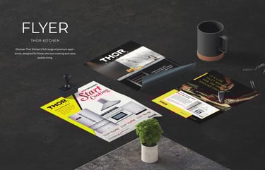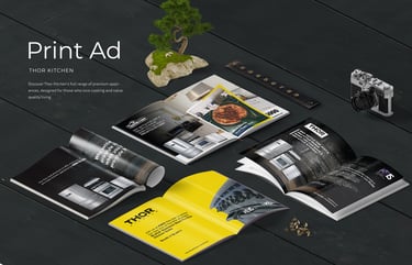 A showcase of printed brand materials including catalogs, brand books, company profiles, and packaging. Each piece highlights thoughtful layout and precise detail, using print as a medium to communicate brand value and visual identity through tangible, well-crafted design.